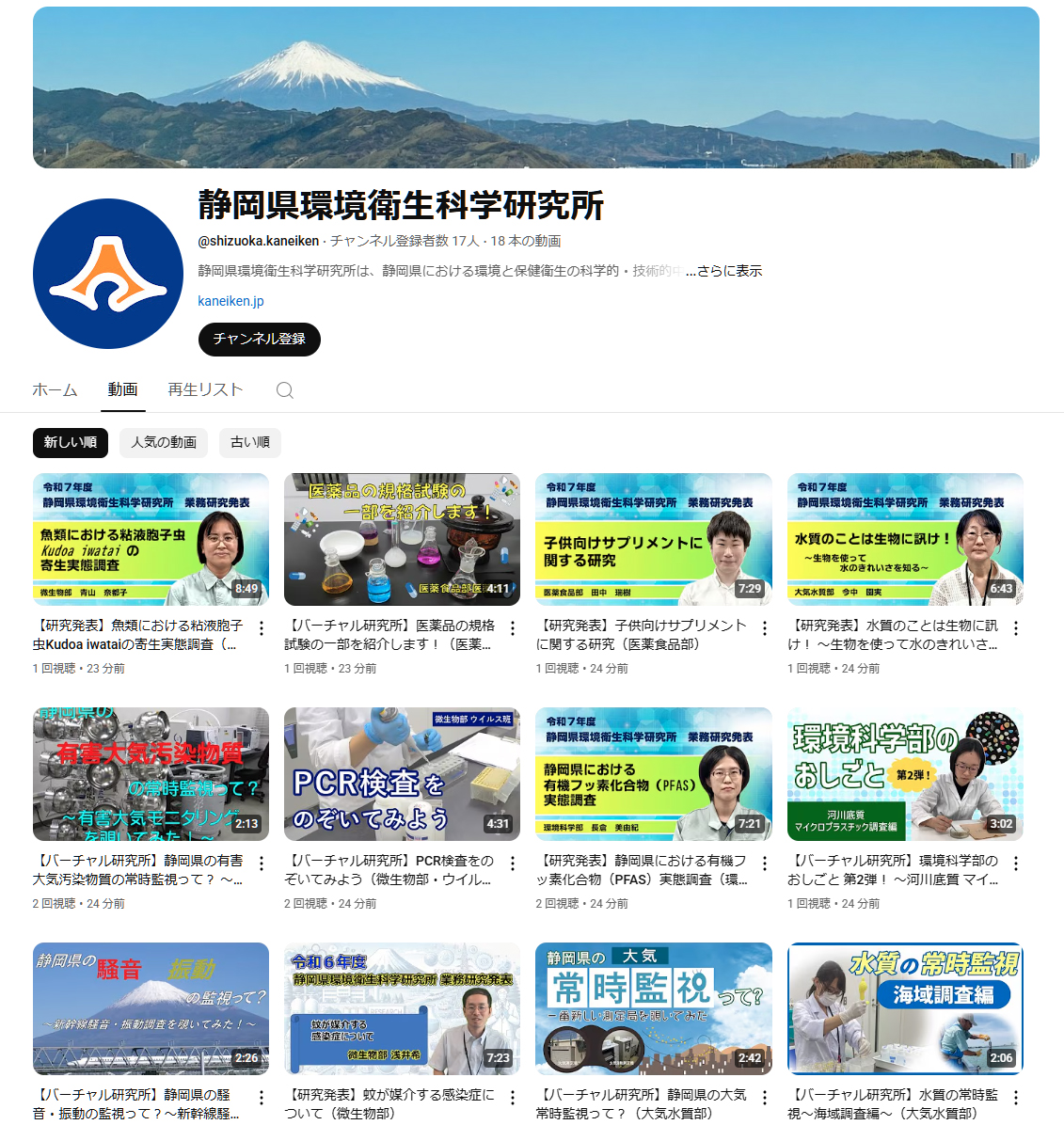 環境衛生科学研究所では、大気・水質環境、医薬・食品、微生物等各分野の研究成果等を県民の皆様に知っていただくため、業務研究発表を行っております。昨年度に引き続き、本年度も静岡県環境衛生科学研究所ウェブサイト特設ページやYouTube環衛研チャンネルでの動画配信とし、業務研究発表をより広く知っていただけるようにいたしました。